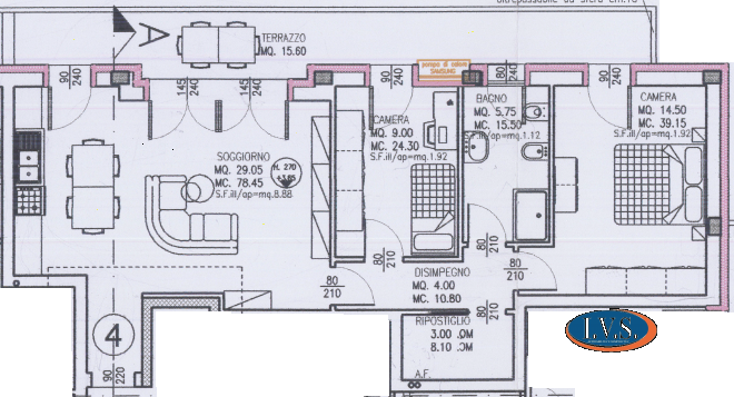 L' appartamento si sviluppa con soggiorno - angolo cottura, 2 camere e 2 bagni, poggiolo di circa 20 mq., garage e posto auto.