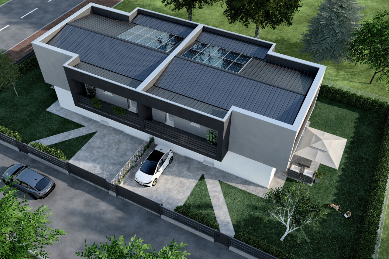 Un luminoso ambiente open space di 50 mq accoglie il soggiorno e la cucina, con uscita diretta sul verde privato. Completano il livello il garage collegato internamente, un bagno/lavanderia finestrato e un comodo vano ripostiglio.